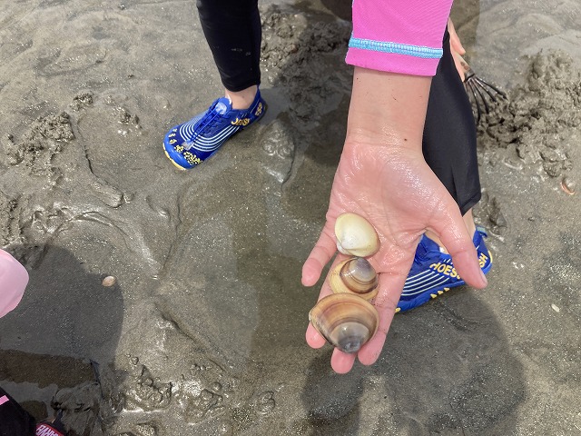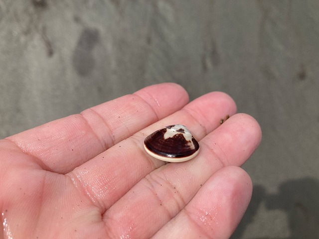 ハマグリの成果は……残念ながら、稚貝を数個みつけただけで、食べられるサイズのハマグリには出会えなかった。※ 御殿場海岸では3㎝以下のハマグリは採取禁止です。
