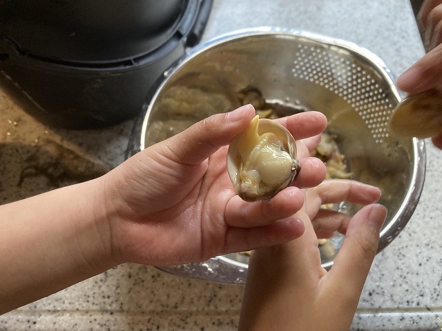 砂抜きを終えた貝たちをいよいよ調理へ。