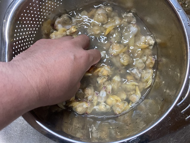 ⑤ 水をかえながら複数回やるとベスト バカガイとシオフキは特に砂が多いので、一度水を替えてもう一度砂抜きするとより安心。