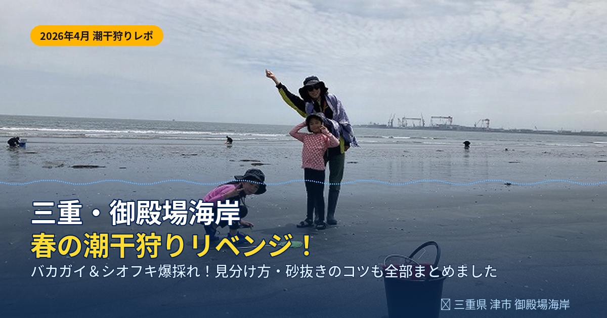 ハマグリこそ逃したけれど、十分すぎるくらいの収穫と楽しい時間を過ごせた。御殿場海岸は名古屋や大阪からもアクセスしやすく、潮干狩りシーズン(3月〜6月頃)は家族連れで大賑わいになる三重を代表する潮干狩りスポットです。